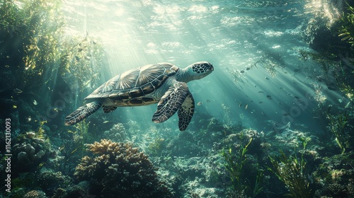 Fototapeta premium Majestic Sea Turtle Gracefully Swimming Through Sunlit Coral Reef