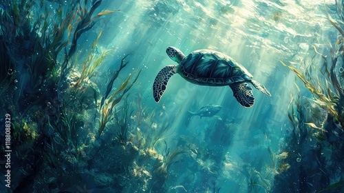 Fototapeta premium Majestic Sea Turtle Swimming Among Colorful Underwater Plants