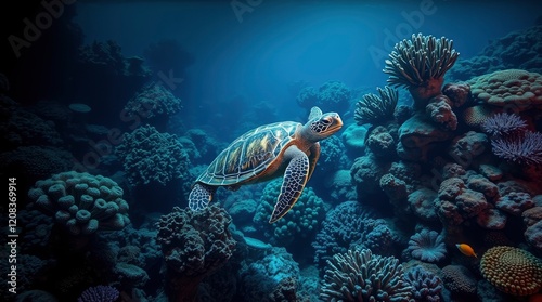 Naklejka premium Majestic Sea Turtle Swimming in Vibrant Coral Reef