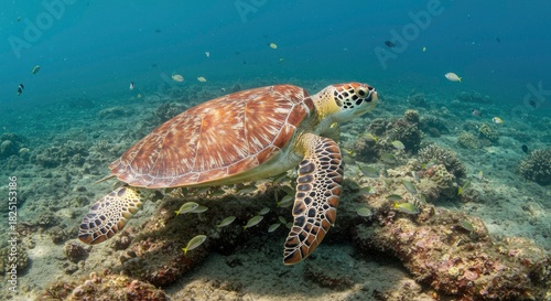 Obraz premium Majestic Sea Turtle Swims Gracefully Through Coral Reef Ecosystem
