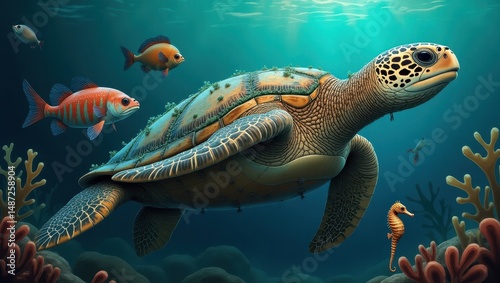 Fototapeta premium Majestic Sea Turtle Underwater Scene with Colorful Fish and Seahorse