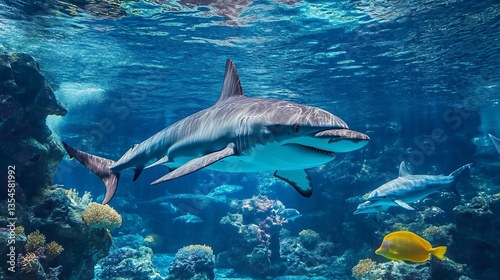 Fototapeta premium Majestic Shark and Marine Life in a Vibrant Underwater Ecosystem
