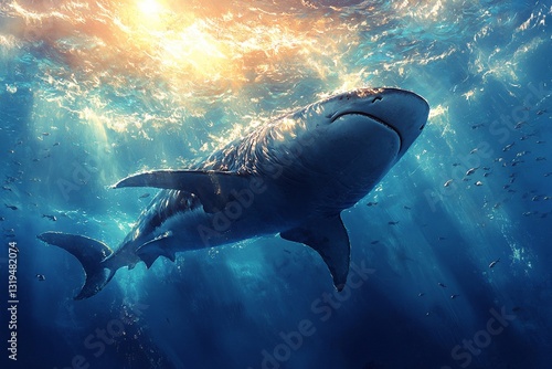 Fototapeta premium Majestic shark gliding through tranquil ocean depths with rays of sunlight