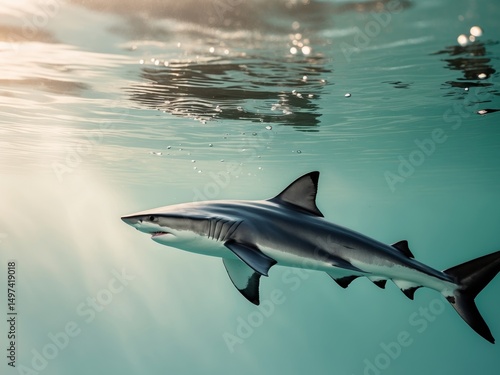 Fototapeta premium Majestic Shark Gliding Underwater, Bathed in Sunlight, Showing the Oceans...