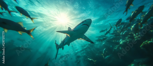 © BCT Creative Stock , Fototapeta premium Majestic Shark in Sunlit Deep Ocean