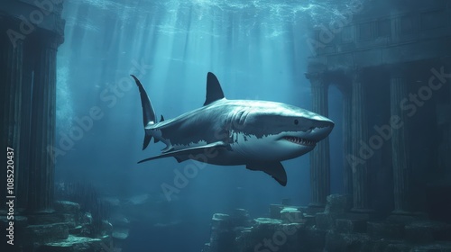 Fototapeta premium Majestic Shark Swimming Amidst Ancient Ruined City Underwater