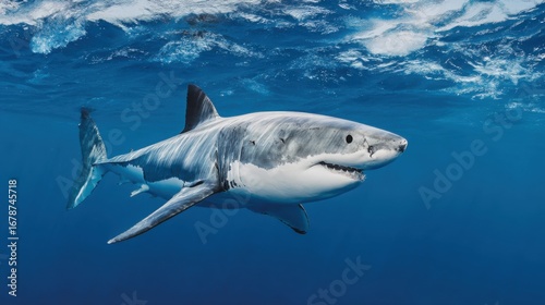 © Thinnawat, Naklejka premium Majestic Shark Swimming Gracefully in Clear Ocean Waters
