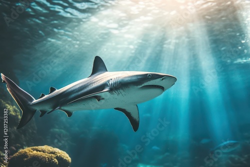 © mohdakram, Obraz premium Majestic Shark Swimming Gracefully in Crystal Clear Ocean Waters Illuminated by Sunrays, Showcasing the Beauty of Marine Life and Underwater Exploration