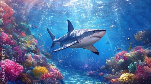 © SETSU 21, Fototapeta premium Majestic Shark Swimming Through Vibrant Coral Reef with Sunlight Filtering Through Ocean Waters