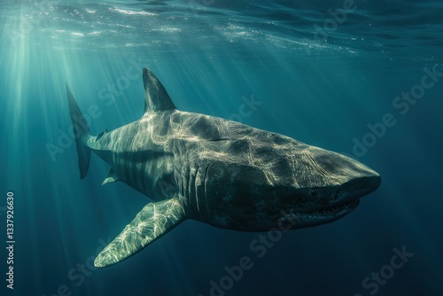 Fototapeta premium Majestic Shark Swimming Underwater in Clear Blue Ocean Waters