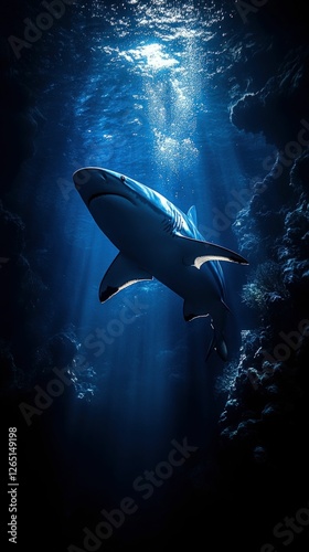 Fototapeta premium Majestic shark swims deep ocean sunlight