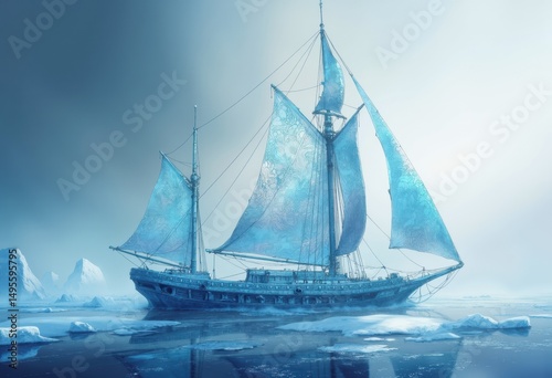 Fototapeta premium Majestic ship sailing through icy waters with vibrant blue sails
