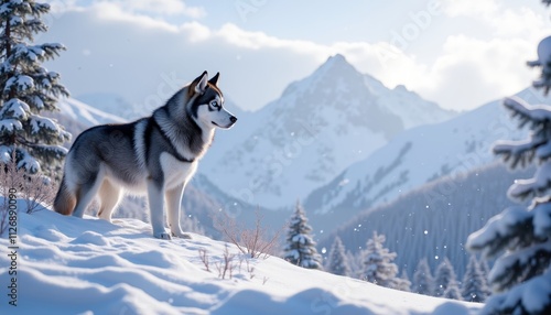 Fototapeta premium Majestic Siberian Husky Stands Proudly in Snowy Winter Mountain Landscape