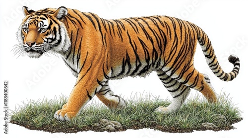 Naklejka premium Majestic Siberian Tiger Walking Through Grassland Wild Cat in Nature Detailed Illustration