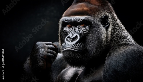 © ChaokuayOfficial, Obraz premium Majestic Silverback Gorilla with Intense Gaze and Powerfully Muscular Build in Low Light Setting