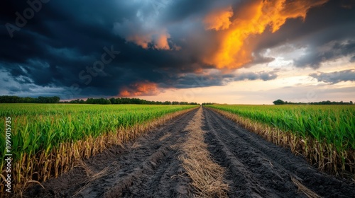© khonkangrua, Obraz premium Majestic Skies Over Fertile Crop Fields at Dusk