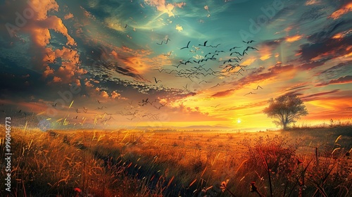 © 熙妍 杨, Fototapeta premium Majestic Sky over Wilderness at Sunset: A Spectacular Natural Scenery. Witness the Beauty and Serenity.
