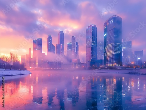 © Thares2020, Fototapeta premium Majestic Skyline at Dawn with Misty Clouds Mirrored Skyscrapers Piercing the Serene Sky