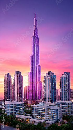 © Nur, Fototapeta premium Majestic skyscraper at sunset, surrounded by city buildings