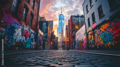 © Alpha, Obraz premium Majestic skyscrapers pierce the morning sky, their foundations illuminated by colorful street art, creating a lively contrast of modern and artistic urban life