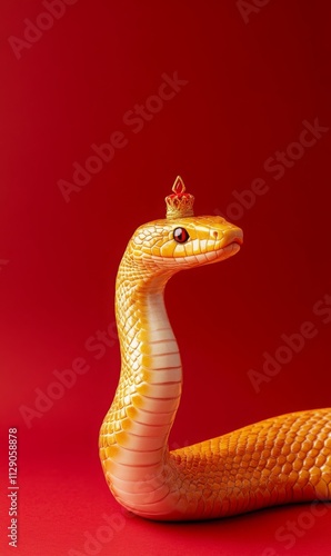 Fototapeta premium majestic snake adorned with golden scales and a small red crown, minimalist red backdrop, Chinese New Year celebration, radiant and joyful, copy space