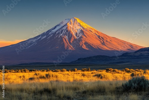 © imagepocket, Fototapeta premium Majestic snow-capped mountain at sunset, casting a golden glow on the surrounding landscape.