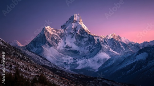 Fototapeta premium Majestic snow-capped mountain peak at sunrise with pink-purple sky, dramatic...