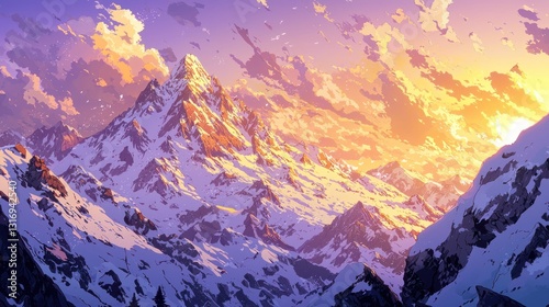 © harryaishi, Obraz premium Majestic snow-capped mountain peak at sunset, vibrant colors, dramatic cloudscape.