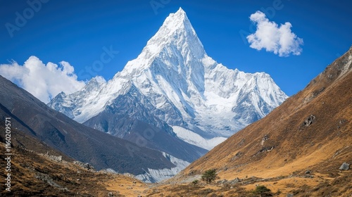 © milenialdesastudio, Fototapeta premium Majestic snow-capped mountain peak rises above valley.