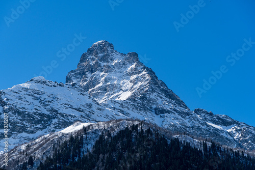 Fototapeta premium Majestic snow-capped mountain peak stands tall against clear blue sky, with rugged terrain and patches of snow covering its slopes. Karachay-Cherkessia. Dombay 2025. Nature concept for design.