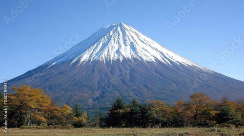 © milenialdesastudio, Fototapeta premium Majestic snow-capped mountain peak with autumn foliage in foreground under clear blue sky.