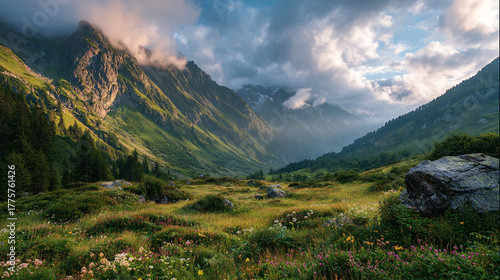 © Stefano, Fototapeta premium Majestic Snow-Capped Mountain Peaks Under Dramatic Sky