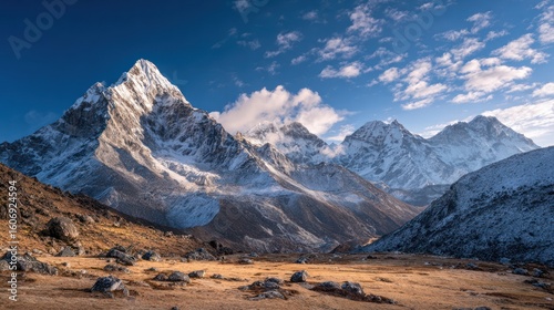 Fototapeta premium Majestic snow-capped mountain range against a bright blue sky with scattered clouds