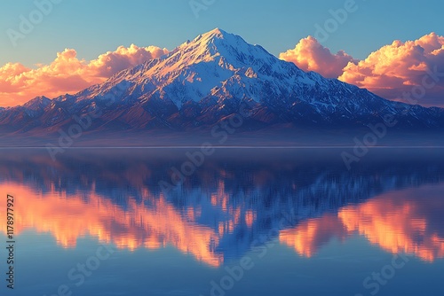 © Diki prayoga, Obraz premium Majestic snow capped mountain reflected in tranquil lake at sunset