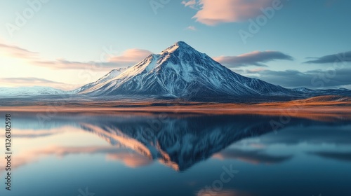 Naklejka premium Majestic snow-capped mountain reflecting in serene lake at sunrise