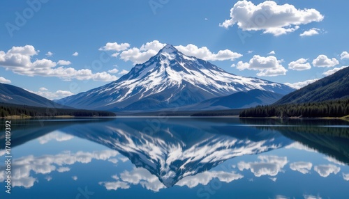 © K-MookPan, Obraz premium Majestic snow-capped mountain reflection on serene lake under a bright blue sky with fluffy clouds