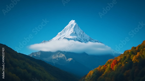 Fototapeta premium Majestic Snow-Capped Mountain Rises Above Colorful Autumn Foliage Under a...