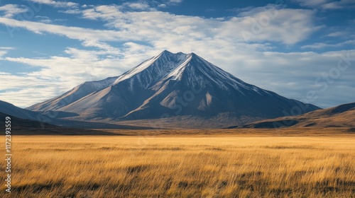 Fototapeta premium Majestic snow-capped mountain under a vibrant sky surrounded by golden grassy plains in a serene natural landscape.