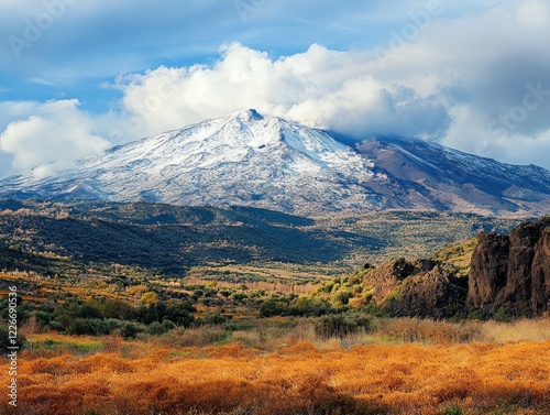 Fototapeta premium Majestic snow-capped mountain with clouds and a vibrant valley under a clear...