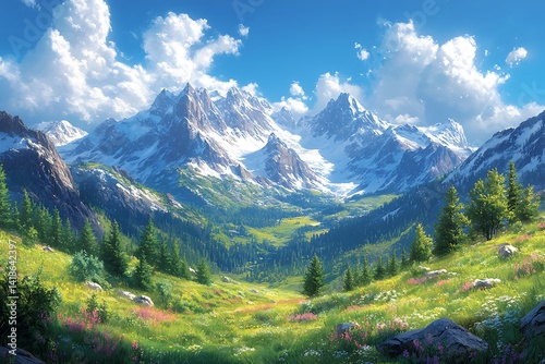 Fototapeta premium Majestic Snow Capped Mountains And Lush Valley Under A Sunny Sky