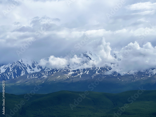 Fototapeta premium Majestic snow-capped mountains and rolling hills under cloudy sky