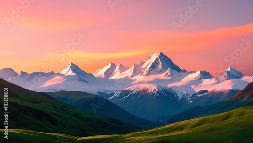 Fototapeta premium Majestic snow capped mountains at sunset over green hills