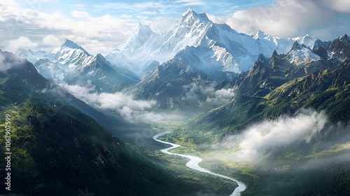 Naklejka premium Majestic Snow-Capped Mountains with a Winding River Valley