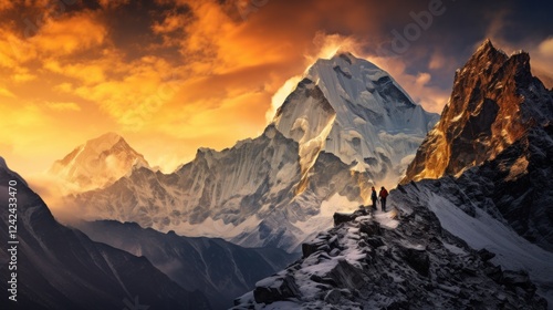 © KOSHKAROV SERGEI, Obraz premium Majestic Snow-Capped Peaks Bathed in Golden Sunset Glow