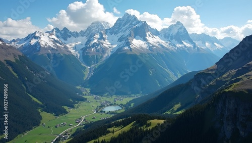 Fototapeta premium Majestic snow capped peaks overlooking verdant valleys with rivers