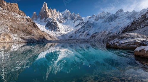 © P.G, Fototapeta premium Majestic Snow-Capped Peaks Reflected in Tranquil Alpine Lake Surrounded by Rugged Mountains Under a Clear Blue Sky at Sunrise