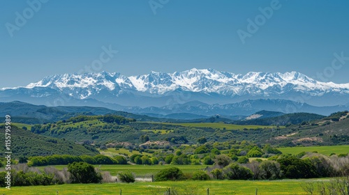 © yusufadi, Obraz premium Majestic Snow-Capped Pyrenees Mountains Overlooking Lush Green Valley