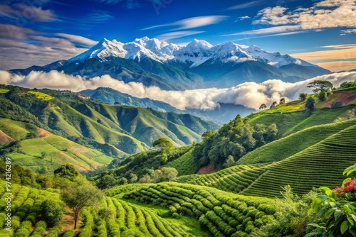 © Arnada, Fototapeta premium Majestic snow-capped Sierra Nevada mountain range rises above lush green coffee plantations and misty valleys in the