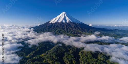 Fototapeta premium Majestic Snow capped Volcano Above Clouds Aerial View