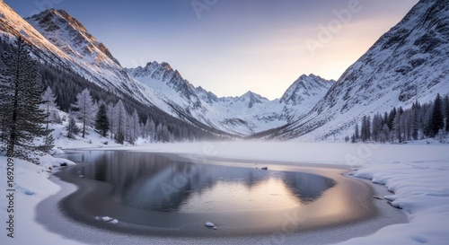 © MuhammadArsya, Fototapeta premium Majestic snow covered mountains reflected in a frozen alpine lake.
